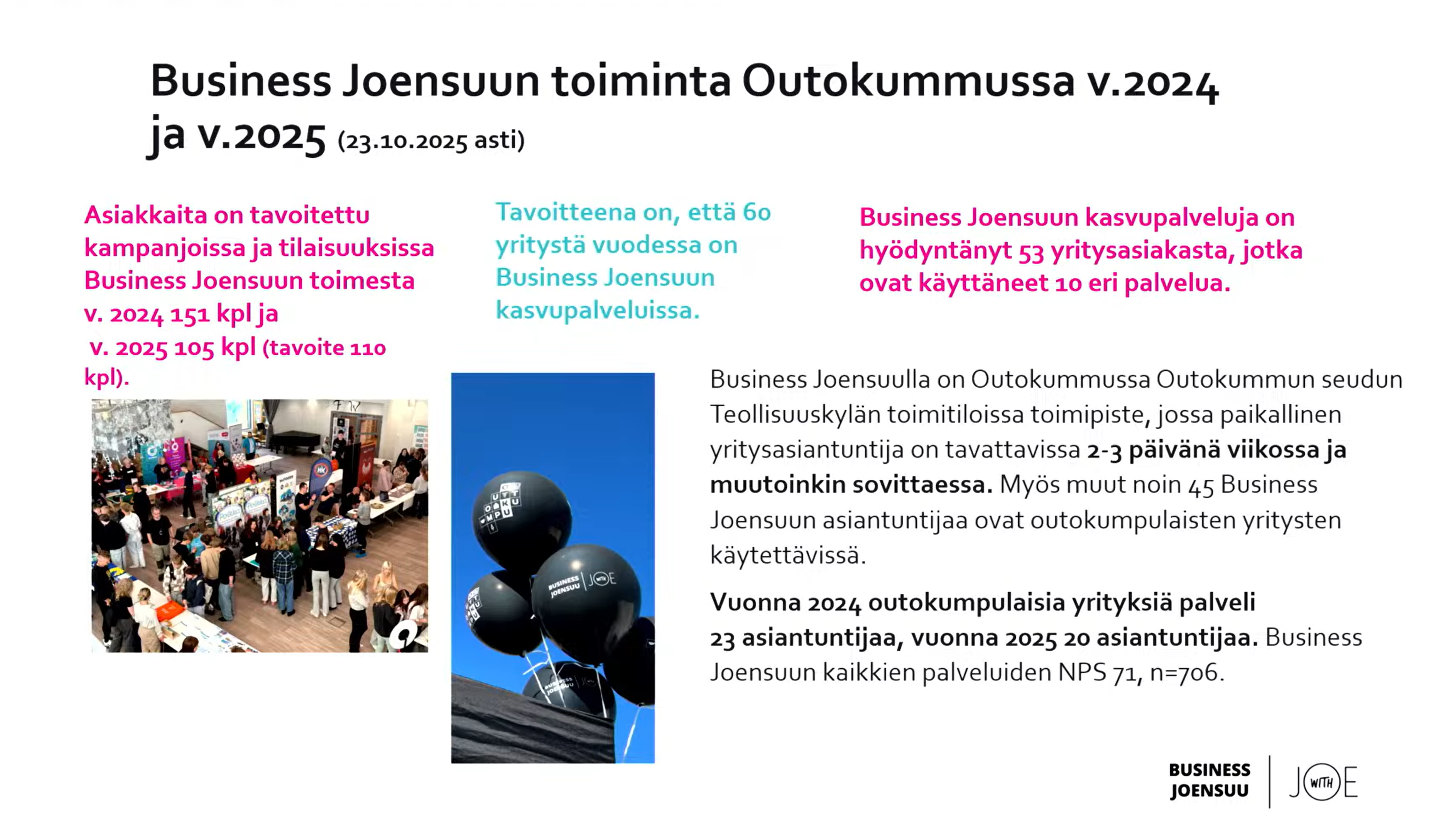 Business Joensuu Oy:n toimitusjohtaja Tomi Haring, palvelujohtaja Mervi Leminen ja yritysasiantuntija Jaana Karppanen kävivät esittelemässä Business Joensuun toimintaa Outokummun kaupunginvaltuustolle. Tomi Haring kertoi Business Joensuun strategiasta vuosille 2024–2026 ja millaisilla askelmilla yritysten kanssa tehdään yhteistyötä. Palvelujohtaja Mervi Leminen ja yritysasiantuntija Jaana Karppanen kertoivat mm. Business Joensuun eri palveluista.