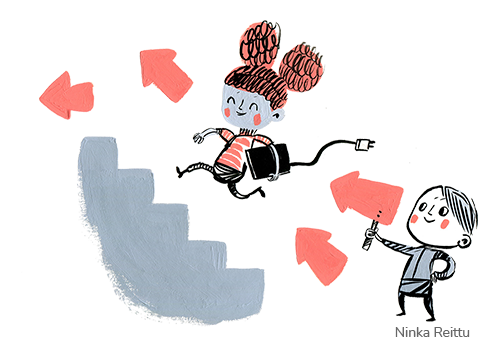 Kuhina-hankkeen kuvituskuva, jossa kaksi piirrettyä henkilöä.